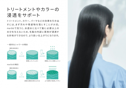 トリートメント剤・カラー剤・パーマ剤などの効果を引き出すには、まず髪の汚れや残留物を落とすことが大切です。施術前にmarbbで予洗いをすることで薬剤の浸透を助けます。さらに、marbbは髪に必要以上の水分を与えないため、毛髪の内部に薬剤が浸透する余地ができ、美しい発色やカールなど、より良い仕上がりが期待できます。
